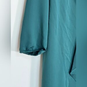 Accents: ruffle front, asymmetrical, long balloon sleeves, keyhole neck,knee length, satin appearance material