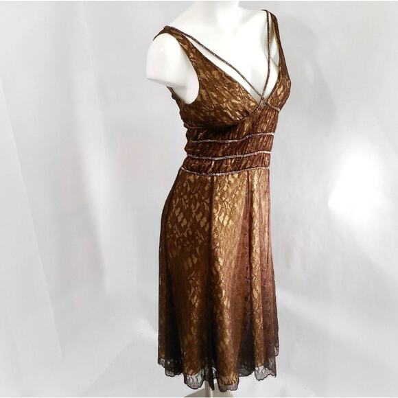 BCBGMAXAZRIA Beaded Lace/Silk Dress Sz 8 Gold/Brown Sleeveless Cocktail Wedding