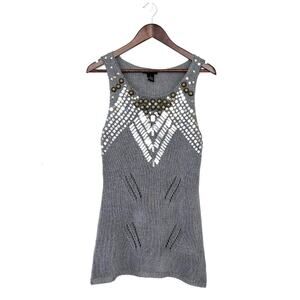 BCBGMAXAZRIA Beaded Sequin Metallic Knit Tank Top | Silver Gray Boho Glam NYE L