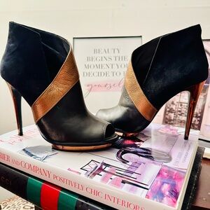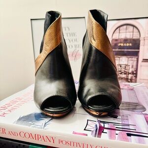 BCBGMAXAZRIA Black and Bronze Leather and Suede Platform Peeptoe Booties, 7 1/2