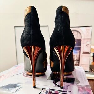 BCBGMAXAZRIA black and bronze leather and suede platform peeptoe booties, size 7 1/2 in EUC. These show very minimal signs of wear (some creasing from wear which is normal and wear on the bottoms of the shoes, all shown in pictures), considering these are about 10 years or so old, I would say they held up really great (especially compared to other shoes I had that cannot say the same). The platform is 1/2” and the heel measures 4 1/2” (essentially making it a 4” heel). These are great for the fall season!