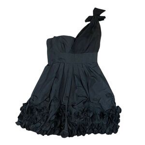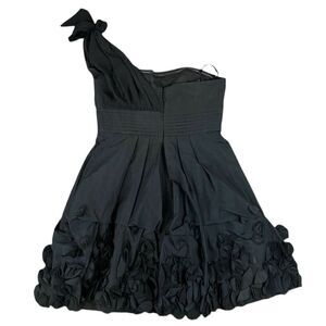 BCBGMAXAZRIA Black One Shoulder Mini Dress with appliqué flowers pleated waist, gathered appliques at hem and concealed zip closure at center back.