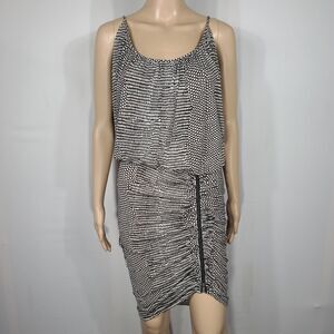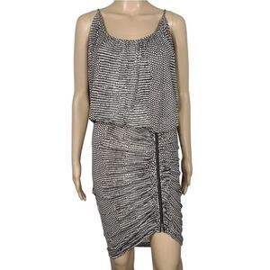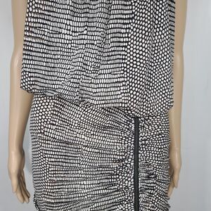 BCBGMAXAZRIA Sleeveless black and white dress with drapey armholes, dotted ruched stretch jersey, scoop neckline, elasticized waist shaping blouson bodice, fitted skirt with exposed front zip down left side, polyester and spandex material, and assymetric hem