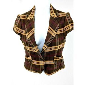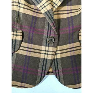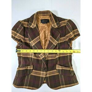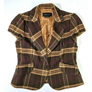 BCBGMAXAZRIA Women's size XS Blazer Jacket. Brown, Tan, Purple, and Black Plaid. Ruffle like cap sleeves. Pockets might still be sewn closed so you may need to un-stitch them if you want to use them. Super cute Academia style or perfect for office. Fitted style not boxy. Measurements in photos. Very good pre-owned condition. No rips, holes, or stains. Comes from smoke free environment.