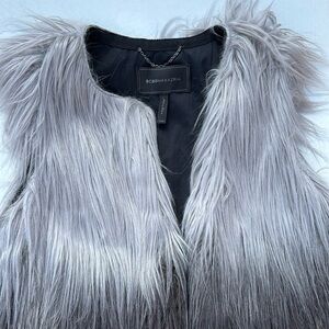 The gradient faux fur vest in deep gray and black makes an instant impact on every look. Round neck, sleeveless, hook closure at center front.
