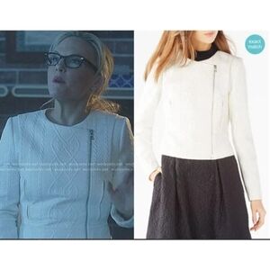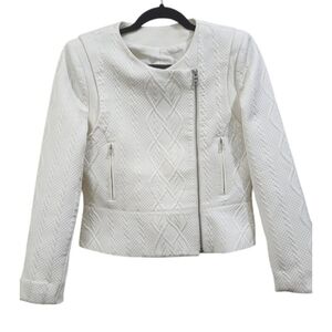 Elevate your style with this stunning BCBGMAXAZRIA Bradlee Cable Jacquard Peplum Moto Jacket, priced at $237. This jacket is perfect for women who love to add a touch of sophistication to their wardrobe. Made of high-quality polyester, the outer shell material ensures that you stay comfortable and stylish no matter the weather. The jacket is designed to fit women of all sizes, with a regular size type and a size M. It comes in a classic white color and features a stylish motorcycle jacket style.