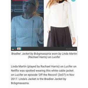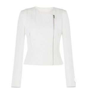 Elevate your style with this stunning BCBGMAXAZRIA Bradlee Cable Jacquard Peplum Moto Jacket, priced at $237. This jacket is perfect for women who love to add a touch of sophistication to their wardrobe. Made of high-quality polyester, the outer shell material ensures that you stay comfortable and stylish no matter the weather. The jacket is designed to fit women of all sizes, with a regular size type and a size M. It comes in a classic white color and features a stylish motorcycle jacket style.