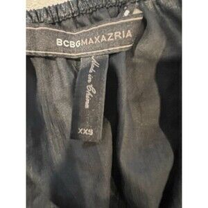 The BCBGMAXAZRIA CLADIANA Metallic Black Dress with Pockets in size XXS is a stylish and versatile addition to any woman's wardrobe. Made from 100% polyester, this knee-length dress features long sleeves and a pullover closure for easy wear. The A-Line silhouette and sleek black color make it suitable for a variety of occasions, while the metallic theme adds a touch of sophistication. With its practical pockets and high-quality construction, this dress by BCBGMAXAZRIA is sure to become a go-to piece for any fashion-forward woman. Elastic up top is very wide and may have possibly been stretched out but its still very cute. 17 inches pit to pit, 28 inch waist and 36 inches long. Smoke free home.