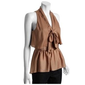 BCBGMAXAZRIA Celline Camel Sleeveless Tie Neck Ruffle Peplum Blouse Size Small