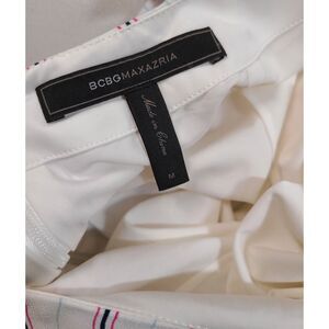 This beautiful BCBGMAXAZRIA Chelsi A-line midi dress features a chic white fabric with red, blue, and black vertical stripes, a flattering high-low asymmetrical hem, and a daring open back with a halter neckline for a stunning silhouette.