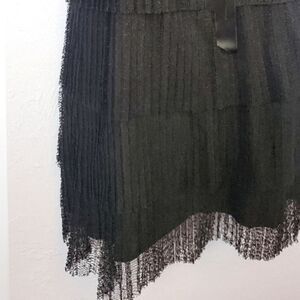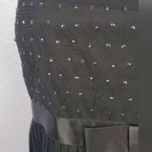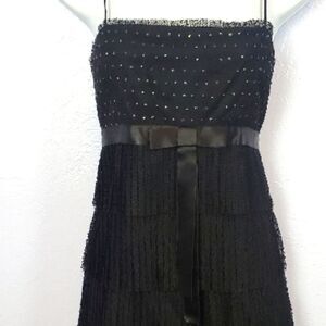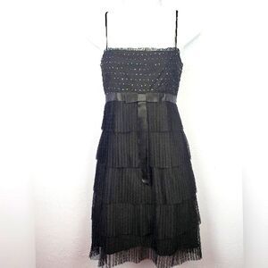 BCBG black cocktail dress for almost any occasion!!, Beaded sequined bust, pleated tiered lace over slip.
