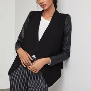 With the edge of a moto jacket & elements of a blazer, this beauty features faux leather sleeves contrasted w/ a matte body & asymmetrical open front.