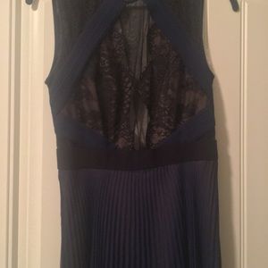 BCBG Max Azria navy & black gown with nude mesh overlay & lace detail.