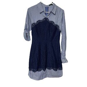 The BCBGMAXAZRIA Dress is a stylish striped dress in blue and white featuring a lace overlay. It has long sleeves with roll tab detail, a collared neckline, and a zip closure. The dress is suitable for various occasions including parties, casual wear, workwear, and business meetings. Made from a blend of polyester, nylon, and 100% cotton in a chambray fabric, this fit & flare shirt dress has adjustable sleeves and embodies a classic yet modern style perfect for summer, fall, or spring. Perfect for women size 8 looking for a preppy and fashionable ensemble.