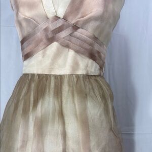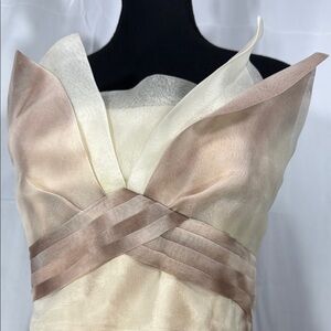 This elegant women's dress features a sophisticated cream and tan design, perfect for any special occasion. The stylish cross-over bodice adds a touch of modern flair. PreOwned