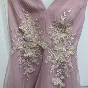 This dress features a delicate tulle overlay with floral embroidery, a flattering sleeveless cut, and a hidden back zipper for a seamless fit. A true showstopper for any special occasion.