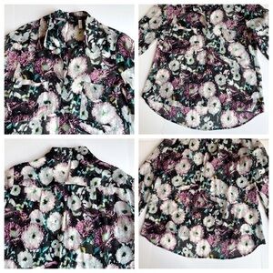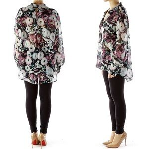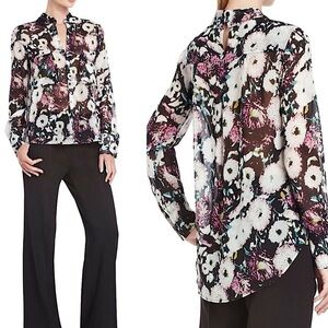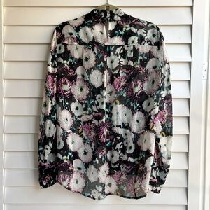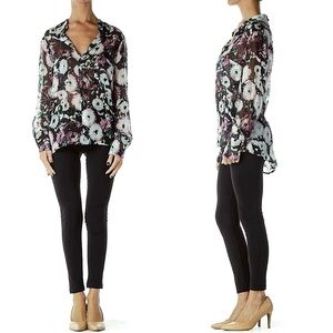 BCBGMAXAZRIA Emma Floral Silk Top in black/ lavender mist floral print. Long sleeve sheer silk top with a collared neckline, patch pockets at the bust, a button-closure keyhole at the upper back and all-over floral print. Longer length in back. Worn but in excellent condition with no visible signs of wear. Approx. 24” long in front, 27” long at longest point on back and 20” across from armpit to armpit.