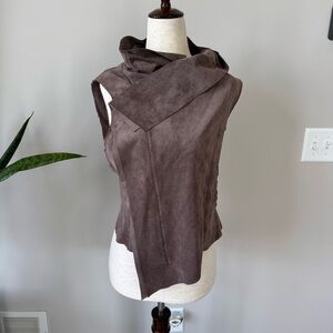 Stylish taupe sleeveless suede vest with a unique collar design. Perfect for layering.