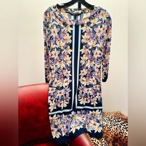 BCBGMAXAZRIA floral multicolored 3/4 sleeve shift dress, XS in EUC. This is such a great “throw-on” dress for multiple occasions- work, brunch, family get together, etc., and it can be styled many different ways. Add a denim jacket and some simple sneakers to dress it down, or tights, boots and a structured jacket or moto to dress it up…or, just by itself with dressy slides or strappy sandals in warmer weather. It doesn’t wrinkle, and it’s lightweight, so it’s great to pack. This is a very versatile dress.