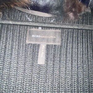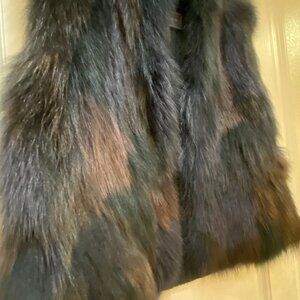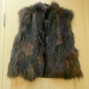is a fur vest, faux fur, with a sleeveless design and a multi-toned appearance, featuring shades of dark grey, brown, or black, creating a textured and layered look.