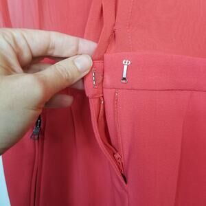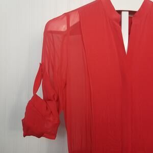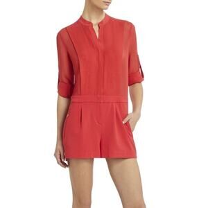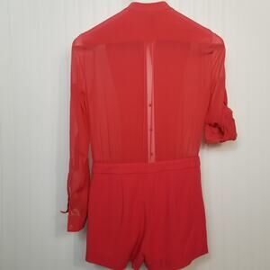 BCBG Romper in poppy red color. Long sleeves with button roll tabs, sheer upper sleeves, back and sides, hidden button front. Solid lower shorts with zip pockets and zip/side closure. Small spot on back as seen in picture, haven't tried removing it.