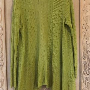 Beautiful very light knitted open sweater ! the color green is bright and gorgeous ! Size Medium ,it is longer on the sides ! In very good used condition! So many compliments! Ask any questions! Thanks!