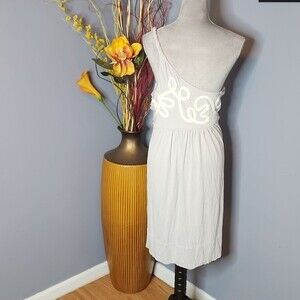BCBG dress gray one shoulder with raised up design on chest. Never worn. Still has part of the tag attached