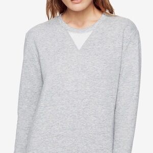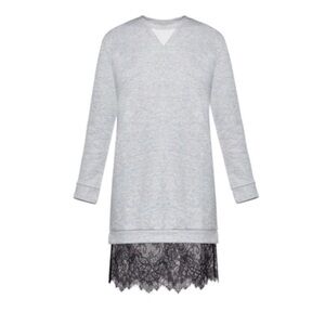 So cozy and chic! I love the hard/soft elements of this dress. Gray upper sweatshirt lower black lace. Long sleeves. Thick sweatshirt material. Banded hemline. Crew neckline. Scalloped-edge sheer lace trim at knee-length hemline. This item has been worn and washed. There are some fabric pills on the inside terry lining- but in otherwise great condition. Perfect for when you want to be comfortable but also a little bit dressed up.