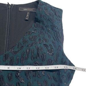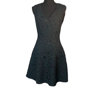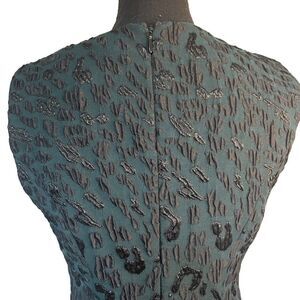 Features and details: dark emerald green with matte and sparkly black leopard-like print, textured, rounded v neckline, sleeveless, fit and flare, zipper closure on back, no pockets, lined, medium weight