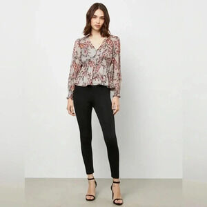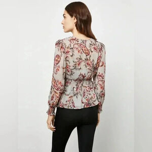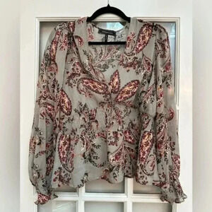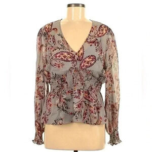 BCBGMAXAZRIA Grey DaytimePrinted Sheer Metallic Top Blouse Size L Large
