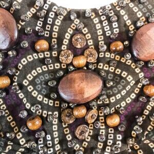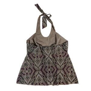 BCBGMaxAzria brown patterned halter tie back blouse with beaded embellishment. There doesn't seem to be any beads missing nor broken. The beads run all the way up the halter top to the tie back. Top portion of blouse is lined, hidden zipper side closure. Great condition.