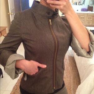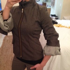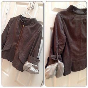 Beautiful Jacket. Brown fitted with puffy sleeves. Very cute and different. 63% Polyester 34% Rayon 3% Elastane. Lining: 55% Polyester 45% Viscose.