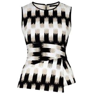 BCBGMAXAZRIA Jolyne Peplum Tank Top with bold, white and black striped color, while an angled asymmetric waistband shapes a flattering silhouette. Round neck, sleeveless, asymmetric waist. Exposed back zip closure. Brand new, perfect condition