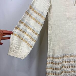 The BCBGMAXAZRIA Keely Tunic Dress is a stylish and versatile piece perfect for any woman's wardrobe. This long sleeve dress features a metallic stripe pattern in a boho, notch neck design. Made from gauzy cotton, this short dress is ideal for a casual, shabby chic look. The ivory color and size XS make it a great choice for a laganlook or cottagecore style. Whether dressed up or down, this dress is sure to make a statement in any bohemian-inspired outfit.