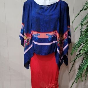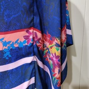 Kei Scarf Print Poncho top Slip on blouse Women Sz XS/S. Inspired by the tropics, the eclectic print on this poncho top levels up your look with vibrant color and energetic spirit 30" chest & 23" length high low effect