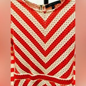 BCBGMAXAZRIA Kristina poppy striped lace a-line zip-back dress, size XS in EUC. This is a bright and fun dress to wear when you feel like dopamine dressing. The bright red/orangish hue of the dress is a mood booster, and the dress can work for the office, parties, showers, and more. The dress is made of cotton, polyester, and spandex, and it is lined.