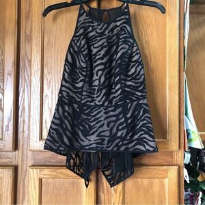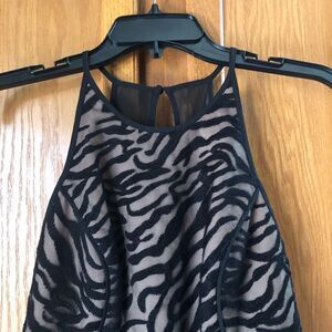 Stylish zebra print halter top. Features a flattering fit. Perfect for a night out. This BCBGMAXAZRIA LARKE sleeveless blouse in size 0 features an intricate embroidered design on a black Mesh fabric, with a stylish cut-out back detail. The blouse has a scoop neck and a button closure, making it suitable for various occasions like travel, parties, or casual wear. The lightweight and sheer Polyester material adds a touch of elegance to the blouse, which is further accentuated by the designer and city themes. This top is a basic yet stylish choice for women looking for a classic wardrobe staple with a modern twist.