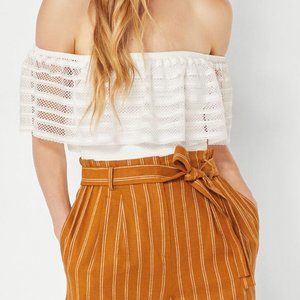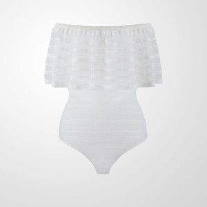 Striped lace knit defines this romantic one-piece, with a ruffled off-shoulder overlay and a snap button closure at the gusset.