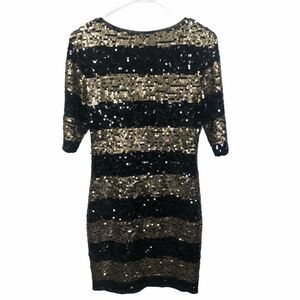 BCBGMAXAZRIA Marta Black Gold Combo Allover Sequin Striped Sheath Dress Womens Medium