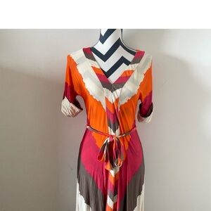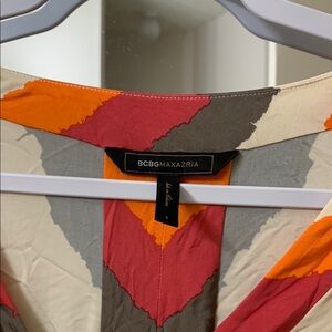Stylish BCBGMAXAZRIA dress with a vibrant multicolor pattern. Features shades of red, orange, and gray.