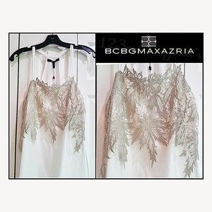 BCBGMAXAZRIA |NEW| OPTIC WHITE Metallic Embroidered Lace Racerback Tunic XS. A gorgeous summer layering piece, if you are into lace, in a super-soft, eco-friendly linen blend. Racerback tunic is embellished with lightly metallic lace trim at the bodice and features eye-catching high side slits. Can be worn both as a dress/tunic top; the length is there for it. See pics. See pics for details and the chest measurement provided below/the Table Chart in the pics to size this dress. Additional specific measurements are provided upon request.