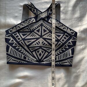 This BCBG sleeveless crop strappy top features a striking asymmetrical design with a bold Aztec southwestern graphic pattern in blue tan and cream. A two-tone, woodblock medallion print is a bold accent to BCBGMAXAZRIA's must-own body-con top that's a favorite for its sleek, figure-sculpting effect. Stretch, geometric knit jacquard, pull-on style The open back adds a unique touch, making it a standout piece for any wardrobe. Perfect for adding a modern edge to your look. Super Stretchy. Excellent new condition. Approximate measurements in photos.