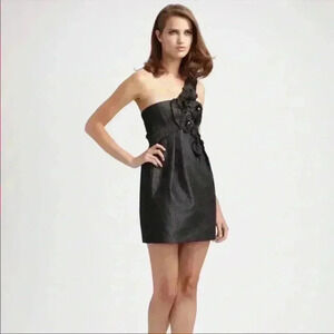 In great condition, super cute black metallic one strapped dress. Floral design with small stones in the middle, zipper closure. 100% polyester