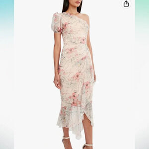 The BCBGMAXAZRIA dress is designed in a one-shoulder style with an allover floral print.