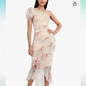 BCBGMAXAZRIA One Sleeve Asymmetrical Ruffle Hem Pink Midi Evening Dress, Size XS