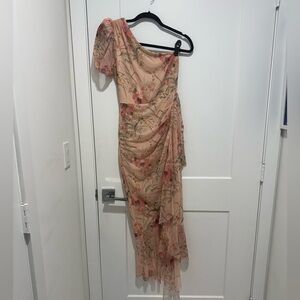 The BCBGMAXAZRIA dress is designed in a one-shoulder style with an allover floral print.