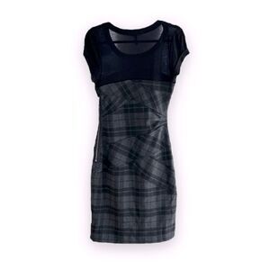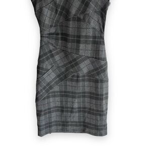 Dress it up or down! BCBG MAXAZARIA gray and black plaid bandage mini dress. Stretchy, semi-sheer, black top (only on neck and shoulders), with thick gray/black plaid bandaging on the bottom (through bust and skirt). Bandaging is on both sides, not just the front, which speaks to the quality of this garment. Chunky side zipper. Size 6 but seems like it might run small (I am not a size 6 so take that with a grain of salt, measurements included below). Roughly knee length. Great/excellent preowned condition! All parts have some stretch.