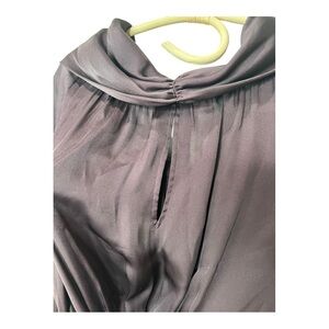 Check out this gorgeous Eggplant Silky Puff Elbow Length Sleeve from Bcbgmaxazria! It’s a pullover with a drapey collar that goes from the front to the back. The back has a cute black long ribbon that ties into a bow. And guess what? There’s a keyhole in the back too! The sleeves are gathered with some puff falls that are about elbow length. The color is a lovely eggplant purple, and it’s made from 100% polyester. It’s so silky and shiny!