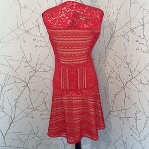 Keywords: BCBG, lace dress, red dress, cocktail dress, party dress, sheath dress, knit overlay, sleeveless, flared hem, textured, evening wear, date night