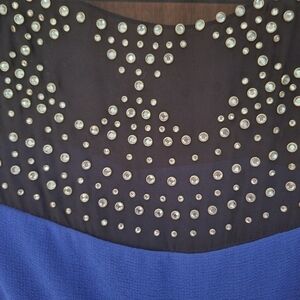 The bold blue-and-black colorblocking creates a striking, refined contrast that photographs beautifully and works well for dinners, cocktail parties, and winter events. The knee-to-mini length keeps the look elegant while still feeling fashion-forward and confident.